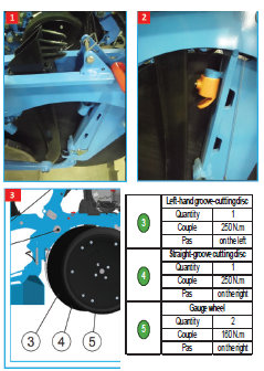• WARNING : When reassembling, follow the instructions regarding the tightening torque for the disc and gauge wheel assembly – Picture 3