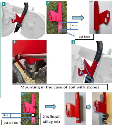 The seeder with the micro granular insecticide design has a micro granular tube for each seeding unit, which drops to the seed furrow behind the gauge wheels. Remove the original lowering holder.